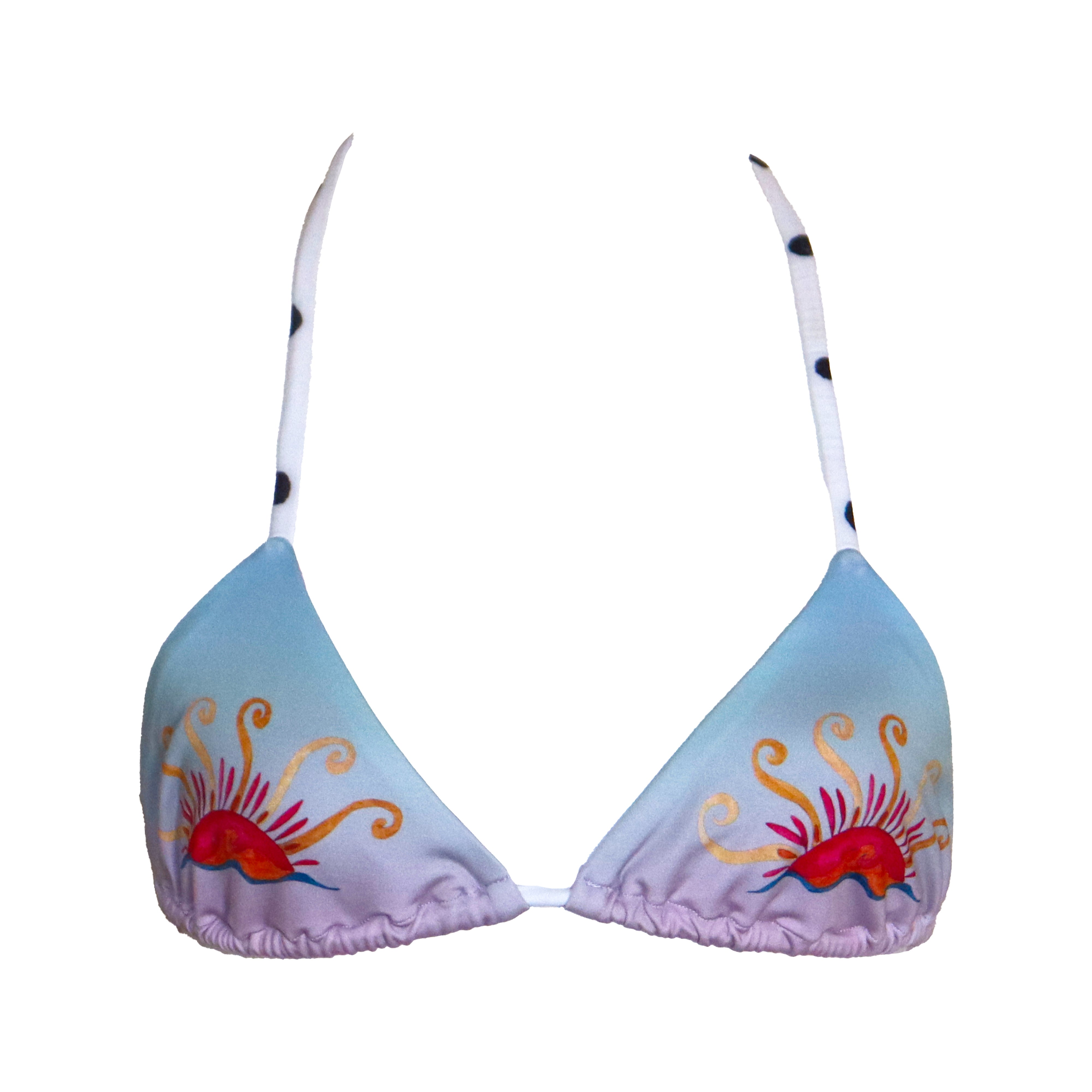 Nuestros nuevos tops triangulares con estampados localizados en forma de sol son uno de nuestros estilos más cómodos. Cuentan con elásticos internos y tiras para ajustar en el cuello y la espalda, además de un estampado con lunares en tonos pastel.